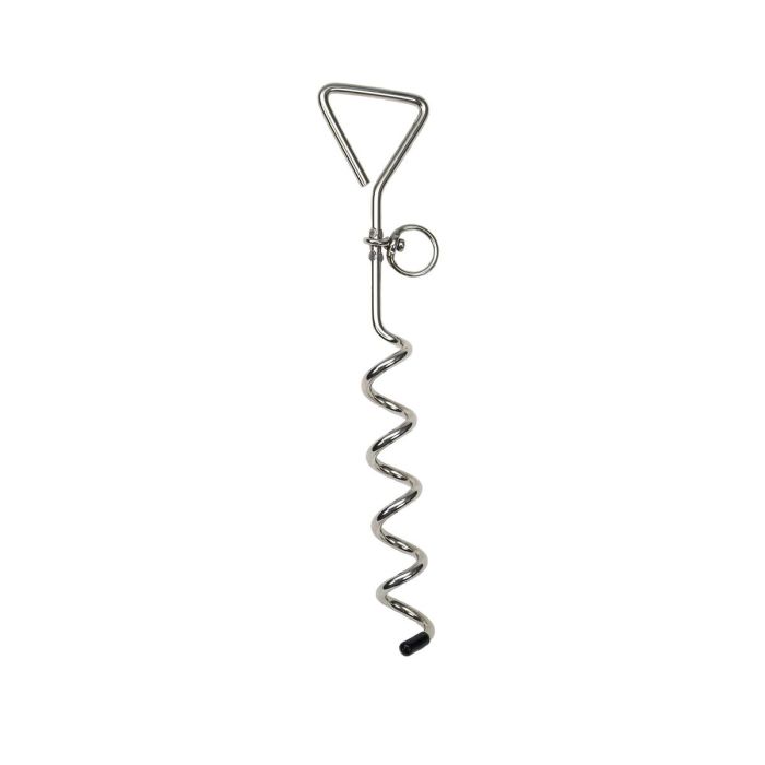 The Spiral Tie Out Stake will provide a solid and secure place to attach your cable tie out. Stake is rust resistant. Measures: 17 inches.