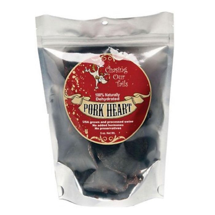 CHASING OUR TAILSYour dog gives you 100% goodness, so give it right back with Chasing Our Tails Dehydrated Pork Heart Dog Treats! These delicious snacks are formulated for dogs of all ages, from training puppies to the older pets with dental issues. This snack is made with USA grown and processed swine and made without added hormones or preservatives because your pup deserves nothing but the best ingredients. Hand-trimmed of extra fat, they are high in protein and dehydrated to retain their natural color, smell and flavor that dogs love. Sourced from USA-grown animals, Chasing Our Tails dehydrated products never contain fillers, artificial colors, flavors or preservatives.