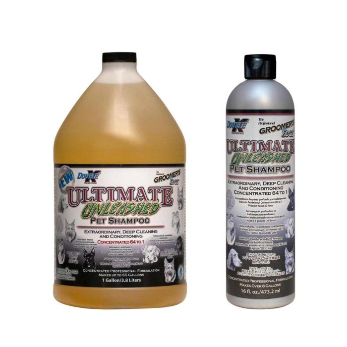 Double K Ultimate Unleashed Pet Shampoo provides ultimate cleansing power, conditioning and value in one convenient package. New formula gently but effectively cleans even the dirtiest and smelliest of creatures, leaving coats soft and shiny with fresh, lasting aloe vera scent. Highly concentrated to dilute 64:1, get hundreds of washes per gallon!