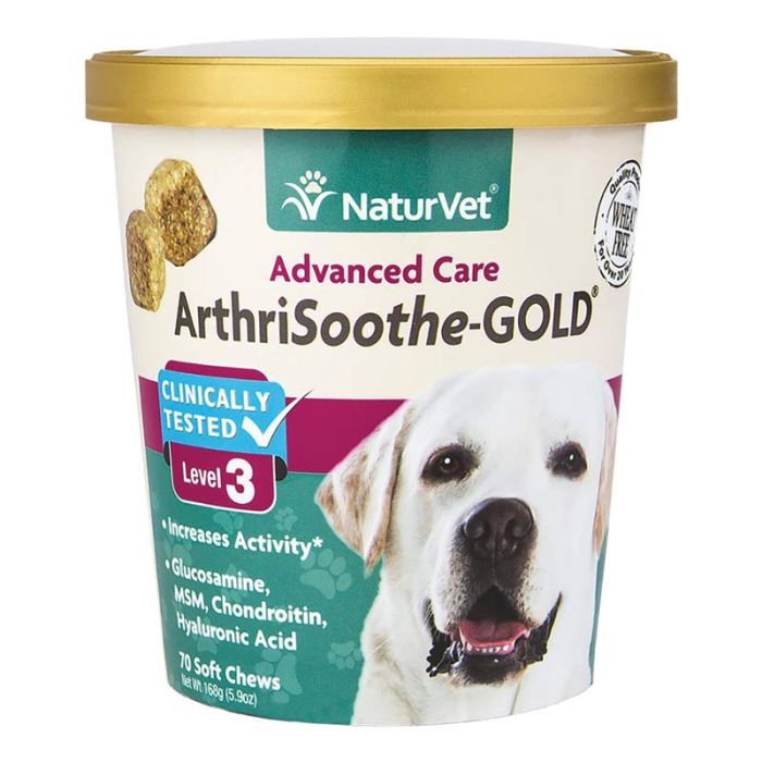 These wheat-free soft chew dog supplements taste like a treat but provide optimal support for your petâs joint health. NaturVet ArthriSoothe Gold Level 3 Advanced Joint Care features nutrients to support lubrication of joints and joint movements. It is veterinarian formulated and clinically tested to increase activity while helping to maintain healthy joint flexibility, connective tissues and cartilage. In a 70 dog double blind University Study confirmed that NaturVet ArthriSoothe-Gold Level 3 Advanced Joint Care Supplements will increase your petâs mobility.