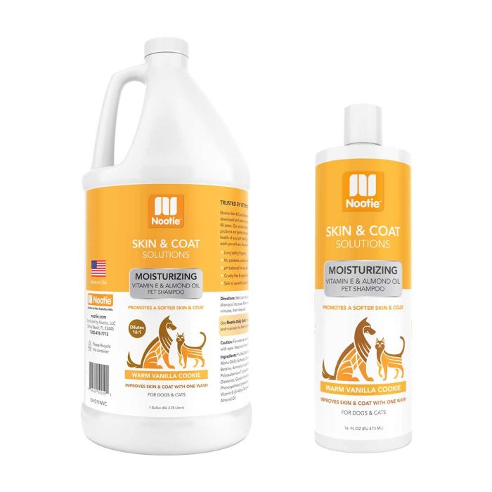 The delicious aroma of Warm Vanilla Cookie combined with sweet almond oil and vitamin E contains essential fatty acids for a shiny, soft coat. Nootie Moisturizing Warm Vanilla Cookie Dog Shampoo is made with natural ingredients and is soap and paraben free. No sulfates or harsh chemicals for gentle cleansing.