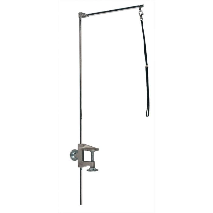 Adjutable grooming arm with one knob to alter height and one clamp to attach to the grooming table.