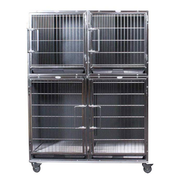 Paw Brothers Professional Modular Stainless Steel Hybrid Cages add to a clean, professional image to any space. The door and cage frame are made of sturdy stainless steel and all panels are powder coated in a sleek Graphite Gray. The removable doors and floor grates make it easy for cleaning. Safety engineered wire spacing at the latches and floor grates prevent animals from getting caught, stuck, dirty from waste, or opening the doors. The floor grates and ABS plastic waste pans will fit other popular cages. All cages are knocked down and must be assembled, allowing for tremendous freight savings!