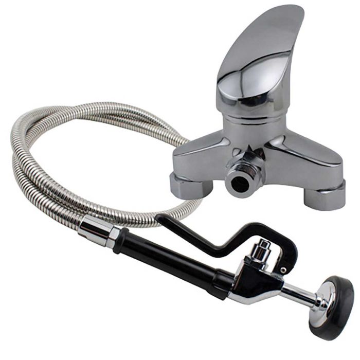 This professional stainless steel lever faucet kit comes complete with two 60 metal 1/2 inch diameter hoses. Faucet has 6 inch center. Can be used with PBP89785. Paw Brothers Professional Stainless Steel Spray Hose Complete.