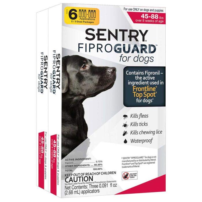 SENTRY Fiproguard delivers protection against fleas, ticks, and chewing lice. Fiproguard is an effective, affordable way to protect your dog from fleas, ticks and chewing lice for 30 days. Contains fipronil, an active ingredient used in FRONTLINE brand products. For use on dogs and puppies over 8 weeks of age. Waterproof. Packaged in USA.