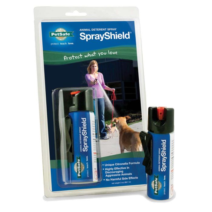 PETSAFEWalk your pet confidently with PetSafe SprayShield Animal Deterrent Spray. This deterrent spray helps protect you and your dog in case you encounter aggressive animals while on walks together. SprayShield Deterrent Spray has a powerful citronella scent that surprises and distracts threatening pets giving you the opportunity to safely move away.