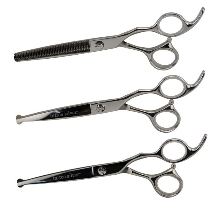 Tattoo Silver Shears are engineered for precision and style. The 3 shear sets feature professional quality in the styles and sizes you use every day. Each set comes in a faux leather case with silencers, polishing cloth, finger rings and tension key.