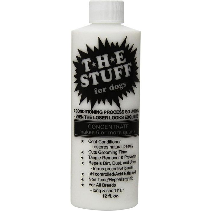 The Stuff is a leave-in hair conditioner and de-matting formula for dogs. This coat conditioner restores natural beauty, protects fur, and cuts grooming time. Removes and prevents tangles, repels dirt, and prevents urine stains by forming a protective barrier. This non-toxic and hypoallergenic grooming spray is pH balanced and works wonders on all breeds both long and short hair. For best results, spray a small amount of The Stuff onto clean, damp fur and groom as usual.