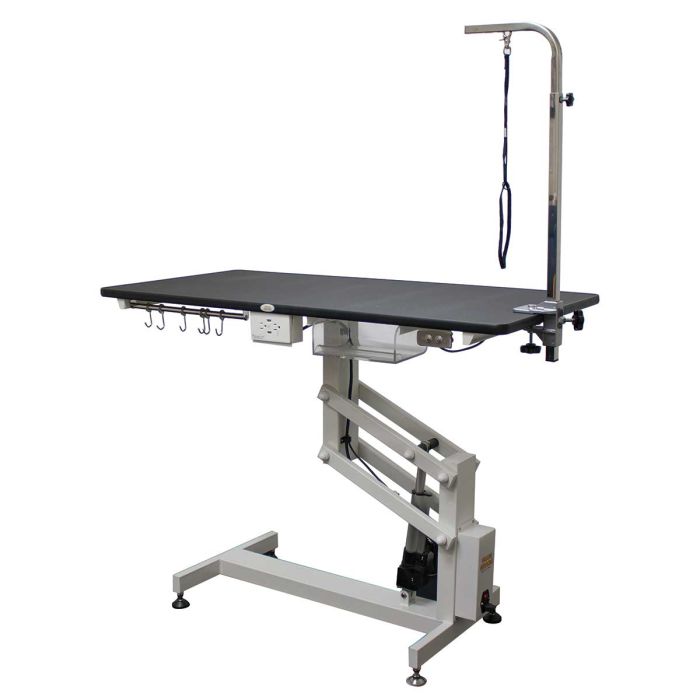 The Value Groom Heavy-Duty Professional Electric Grooming Table is filled with convenient features for groomers! It has a durable, textured rubber top with rubber vinyl edging for stability and accessibility. A telescoping stainless steel arm and clamp with grooming loop keep pets in place while you work. Raise up to 200 lbs on the tabletop from 21â to 40â easily with hand controls. This table also has two AC outlets, two USB ports, 6 movable hooks, and an accessory drawer for convenience.
